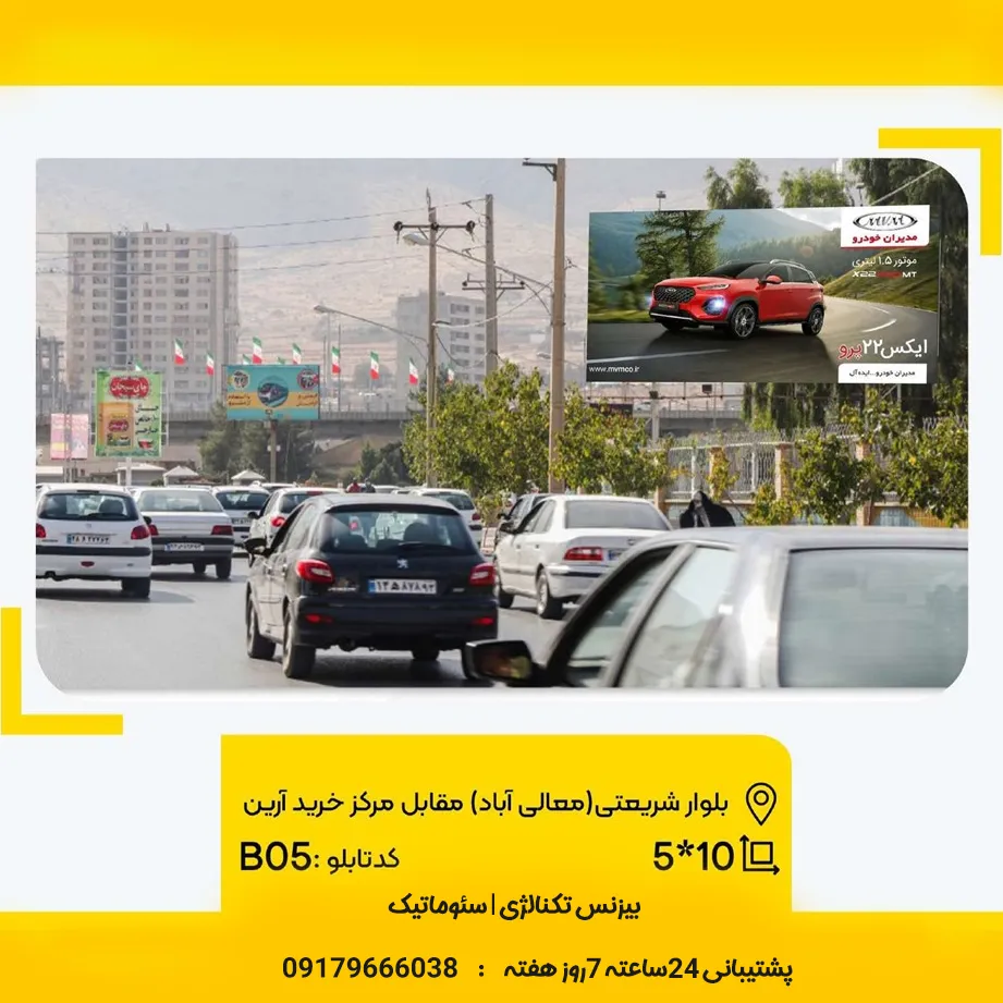 رزرو بیلبورد در شیراز خیابان معالی آباد، روبروی مرکز خرید آرین و نزدیک به بازار لوکس شریعتی، نقطهای استراتژیک است که روزانه هزاران رهگذر و خودرو از آن عبور میکنند.
